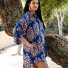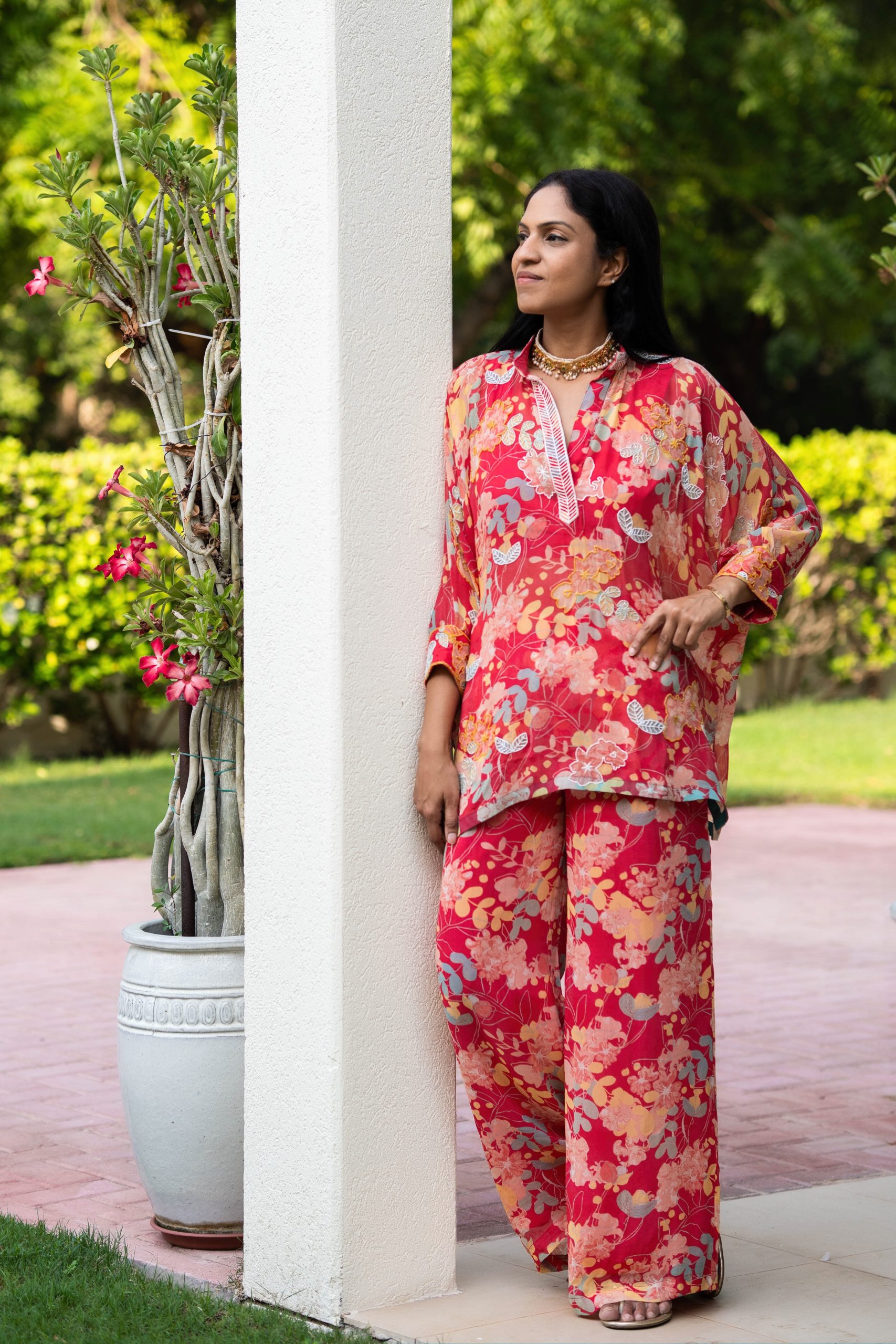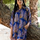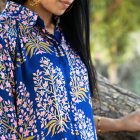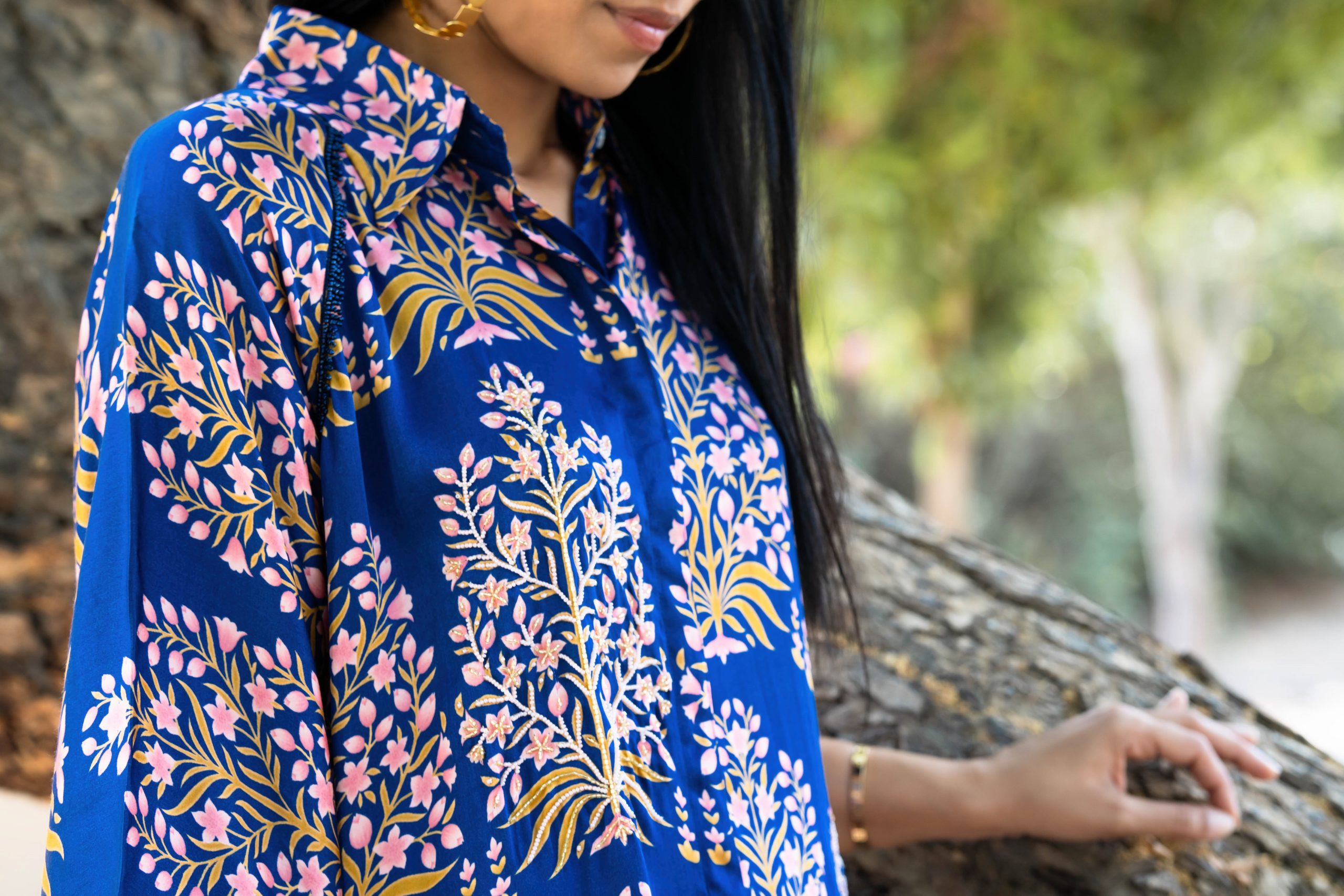Royal Blue Printed Co-ord Set with beaded detailing on the sleeve and placement embroidery on Asymmetrical hem shirt. Lose Fitting shorts with Pockets.