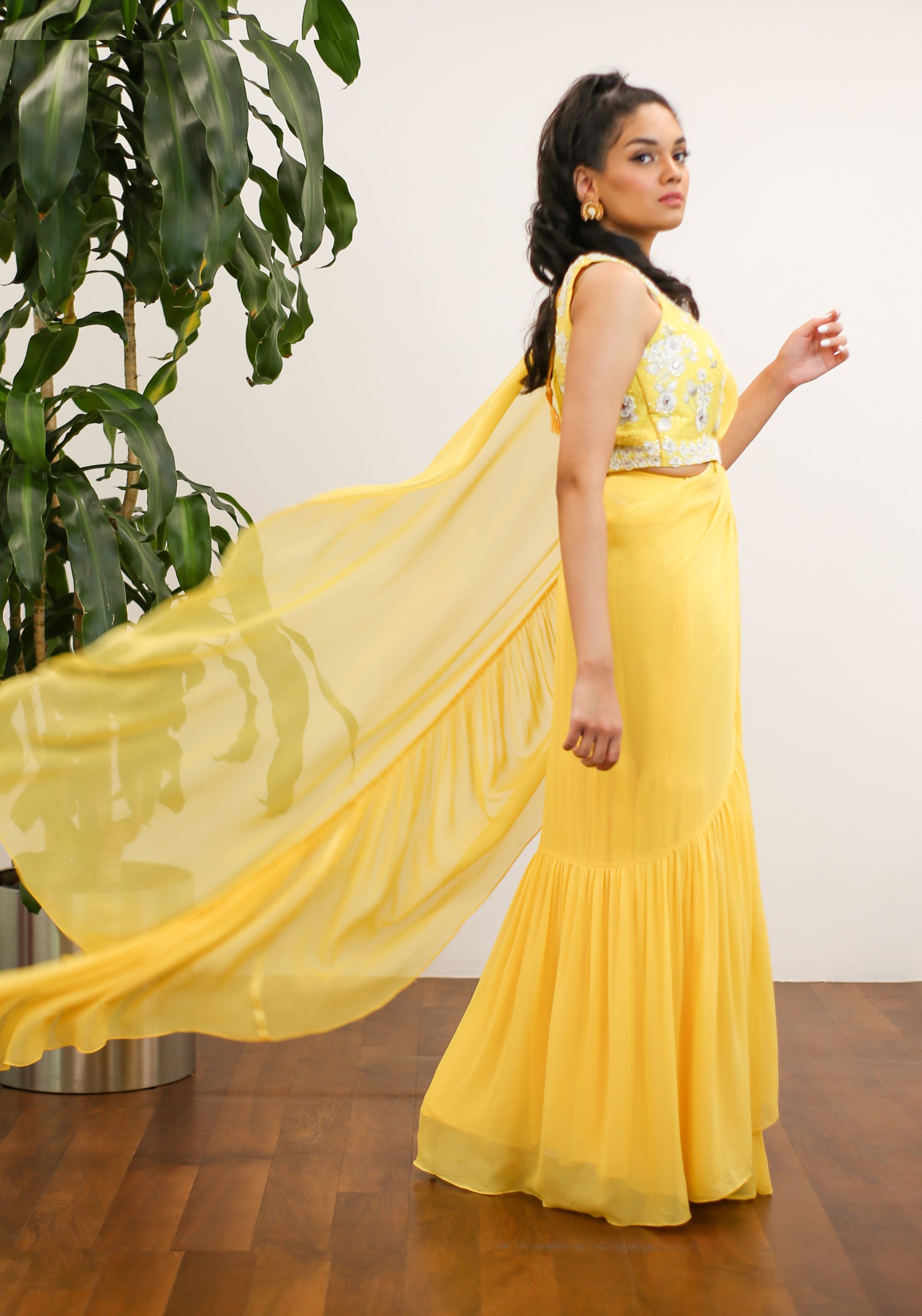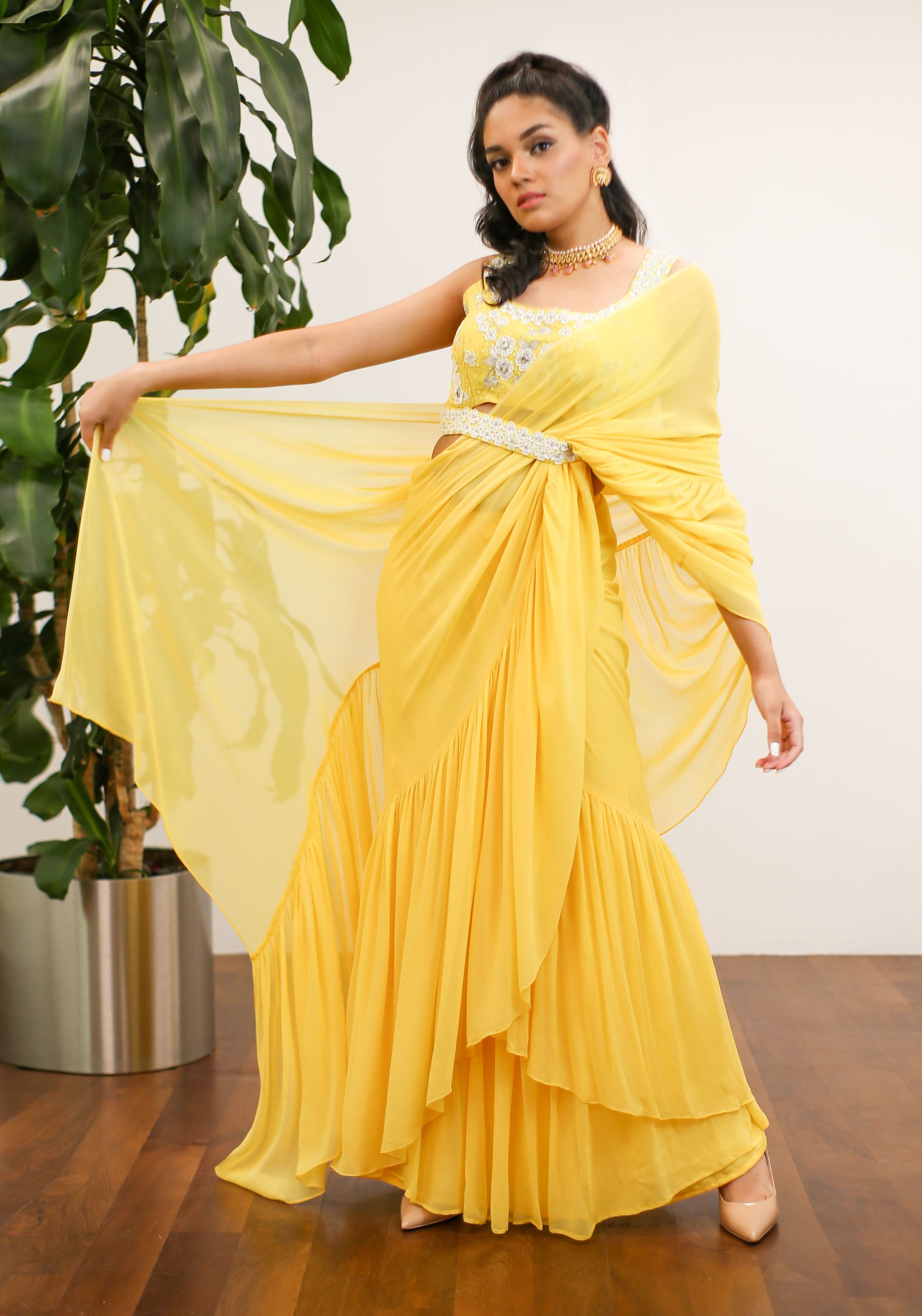 Yellow Pre- Stitched Ruffled Saree and Blouse